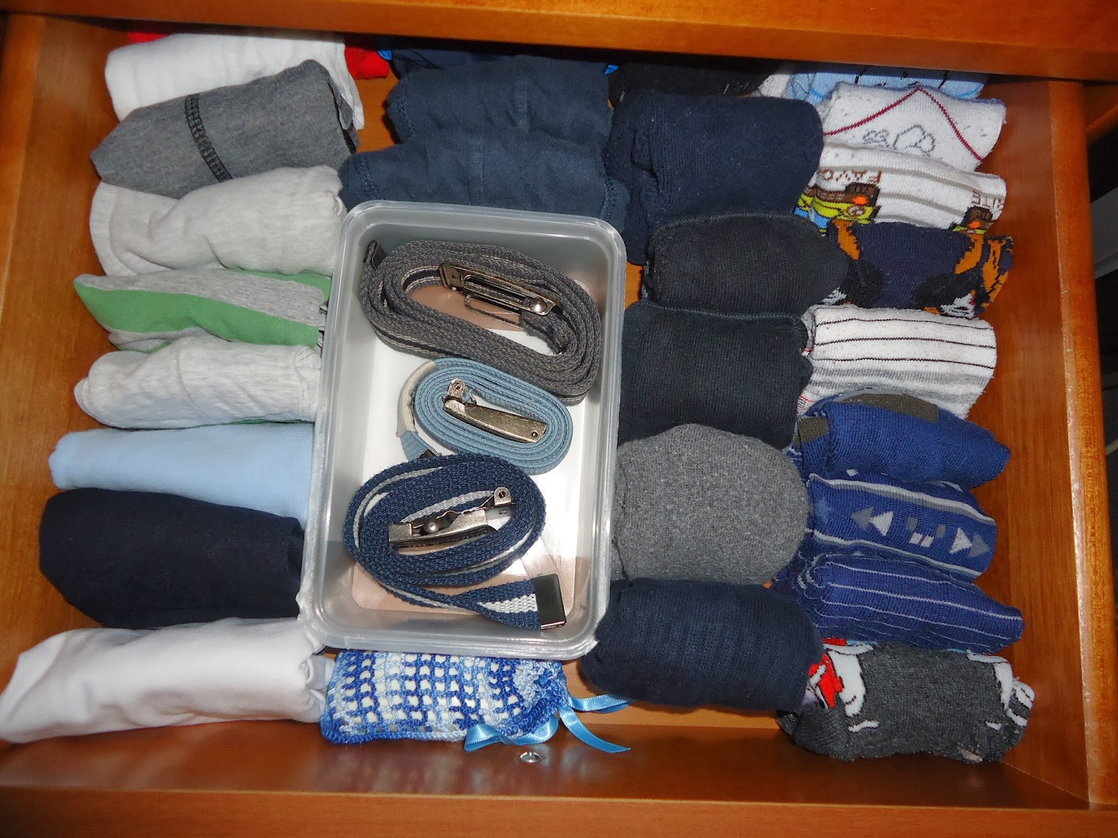 Continuando a organizar, agora foi a vez da roupa interior, usei a forma de dobrar as cuecas e meias que vi aqui e o resultado foi este... as cuecas e meias do Tomás que antes ocupavam 2 gavetas, agora cabem só numa e sobra espaço!!!